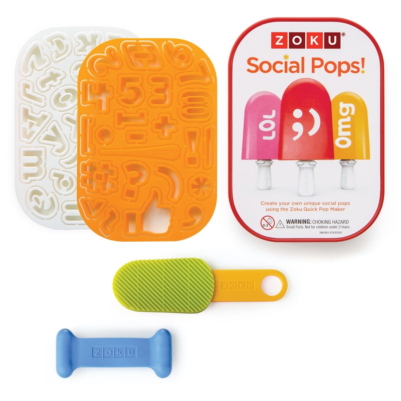 Create your own unique message pops with the Zoku Social Media Kit. Now, pops are just as social as you are. Use Zoku's letters, numbers and symbols to create fun text messages, emoticons, LOL, names, and more! The 53 piece kit includes a storage case. Never before have pops been so much fun or easy to make. Use with Zoku Quick Pop Makers. Follow the instructions to see how you can make social pops in minutes!