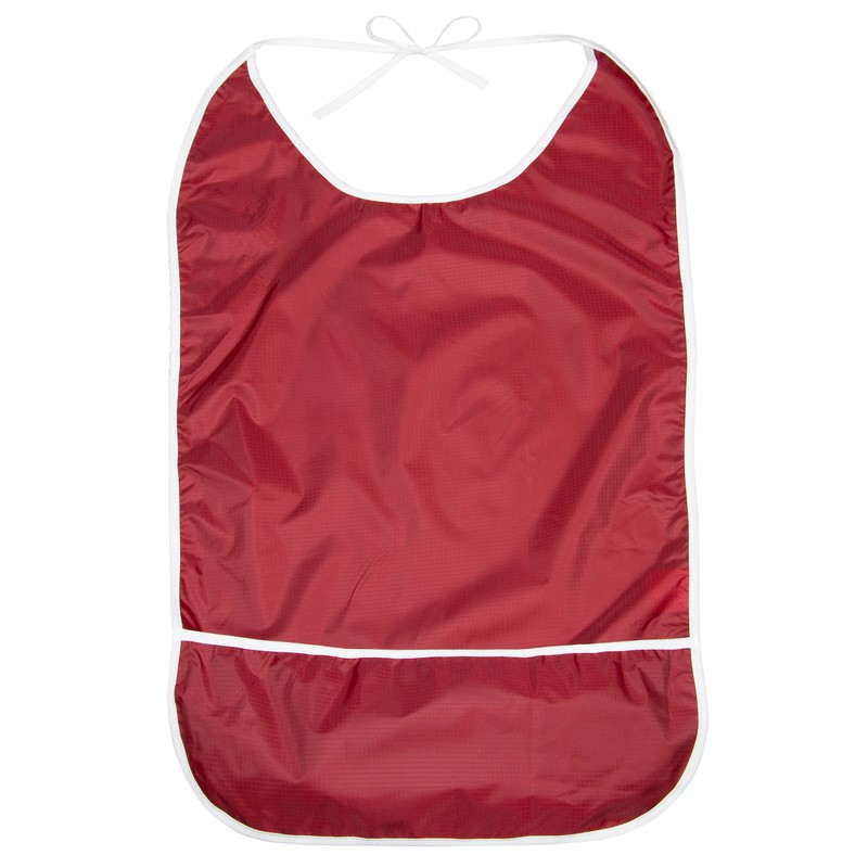 - WATER RESISTANT To protect your clothes from liquids with this adult bib, the bib is water resistant. If dirty, the adult bib can be easily wiped clean with a damp cloth.