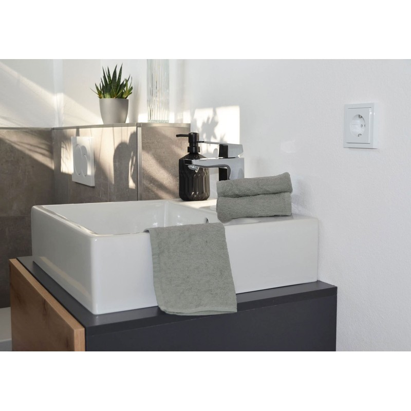 The wash mitt with practical hanger is made from 100% cotton and weighs approx. 400 g/m². Thanks to the processing into terry cloth, the fabric feels super comfortable and fluffy on the skin. The natural product is available in great colours. It has been reactively dyed and is therefore colourfast even after many washes. The cloth is coloured up to 60°C and machine washable up to 95°C in white. For quick use, the cloth is also suitable for tumble drying. The flannel is of course also tested for harmful substances according to Standard 100 by Oeko-Tex (R) – test number 14.HPK.53940 Hohenstein HTTI.