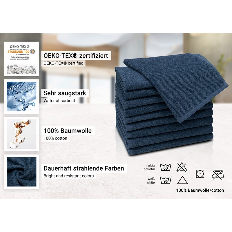 ZOLLNER Set of 10 Guest Towels in 30 x 50 cm – Absorbent and Soft Guest Towels in Dark Blue – with Practical Hanger – Washable up to 60 °C – Cotton – Hotel Quality