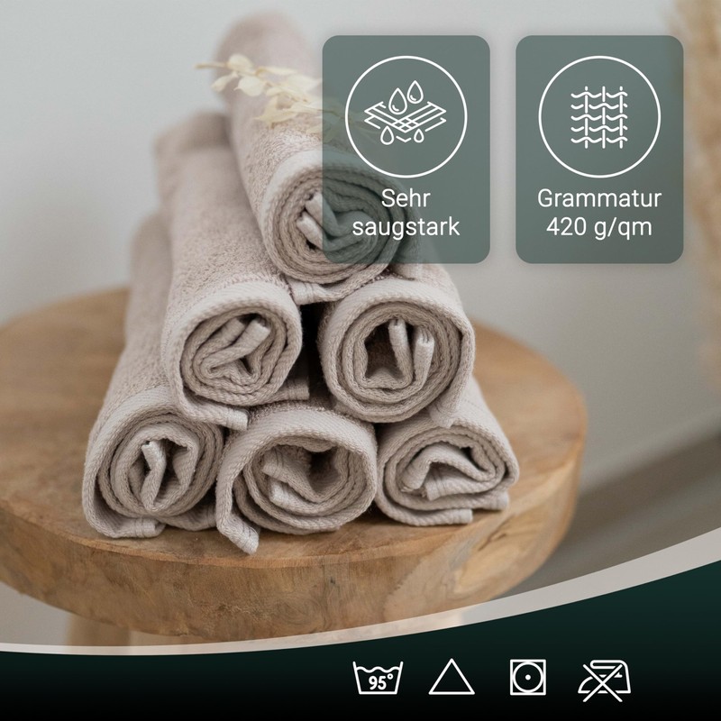 - High-quality material – the fluffy terry towels are made from 100% cotton with a material weight of approx. 420 g/m² which has been processed into terry cloth. Therefore, they are particularly soft and absorbent - great for drying. They also have a practical hanger and are equipped with a double safety seam.