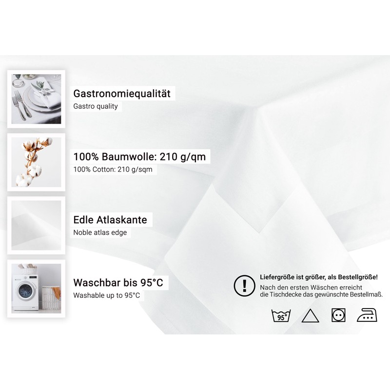 The robust and easy-care table cloths have a material weight of approx. 210 g/m² and are made from 100% cotton. They are washable up to 95 °C and can be tumble dried. The measurements shown correspond to the size after the first wash. Even after several washing and ironing processes, they do not lose their shine and material strength. Any kind of bleaching is allowed and ironing at high temperature is also possible. This elegant table linen presents itself as a simple classic and is available in many different sizes.