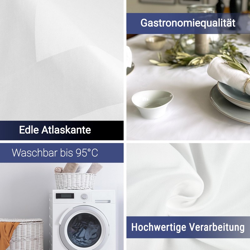 The robust and easy-care table cloths have a material weight of approx. 210 g/m² and are made from 100% cotton. They are washable up to 95 °C and can be tumble dried. The measurements shown correspond to the size after the first wash. Even after several washing and ironing processes, they do not lose their shine and material strength. Any kind of bleaching is allowed and ironing at high temperature is also possible. This elegant table linen presents itself as a simple classic and is available in many different sizes.