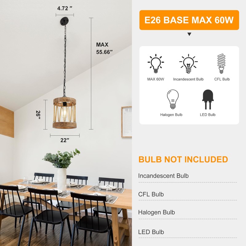 - E26 Base Compatible with Various Bulbs: The rustic pendant light supports an E26 base, compatible with all 60W bulbs, including LED, incandescent, compact fluorescent, and halogen bulbs. This versatility lets you choose the ideal bulb for your lighting needs, ensuring a bright and welcoming atmosphere.