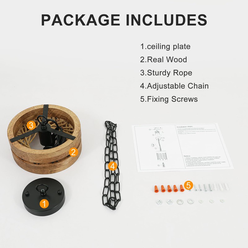 - Rustic Charm with Farmhouse Style: Crafted with a solid wood frame and durable jute rope, this farmhouse pendant light exudes a rustic farmhouse aesthetic. Its design maximizes light diffusion, ensuring ample illumination with just one bulb. Perfect for adding a touch of natural elegance to any space.