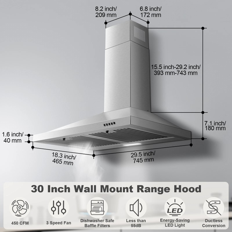 - Wall Mount Range Hood 30 inch: Features 30 inch size perfect to cover entire range’s cooktop, product dimensions 29.5" W x 18.3" L x 36.3" H, electrical requirements: 120V/60Hz, 3 Prong Plug. Our 30 inch vent hood will cover a layer of blue protective film on the unit to prevent scratches during transportation