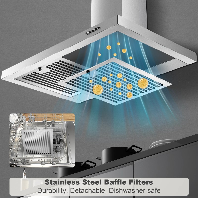 - Vent hood with humanized design: Wall mount range hood comes with two stainless steel baffle filters to absorb grease and smoke. Easy to remove and clean, dishwasher safe. A long energy-saving LED light enough to illuminate the entire stove
