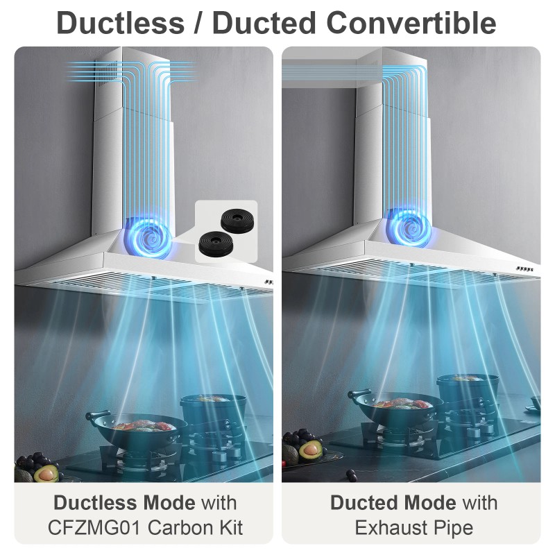 - Ducted/Ductless Convertible: This 30 inch Range hood features a top 6-inch ducted vent that does its job to perfection to keep the kitchen and cooking space smokeless and odor free. Ductless range hood specifically designed for room no extractor duct. Optional Carbon Filter Kit available for ductless (Part CFZMG01)