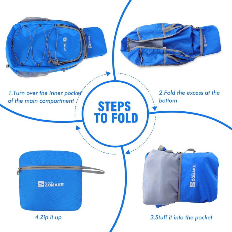 • FOLDABLE TRAVEL DAYPACK:Its storage pocket is a zipper pocket inside the main pocket. Unfold size: 16.5x11x6.75 inches. Folded size only 9.5 * 9.5 inches, only 0.6 lb. When it is not used, fold it into a compact pocket (sandwich size). The ultralight fold-up day pack can be stored anywhere in pockets; suitcases; luggage; handbags;car; etc