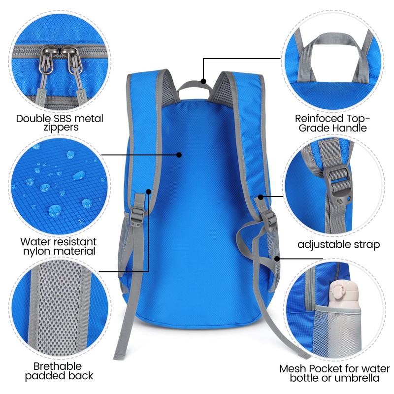 • LIGHTWEIGHT DESIGN:Our 28 L travel backpack is designed for minimalist travelers, without back padding and thick shoulder straps, weighing only 0.55 pounds, reducing shoulder burden. The adjustable mesh shoulder straps are super breathable