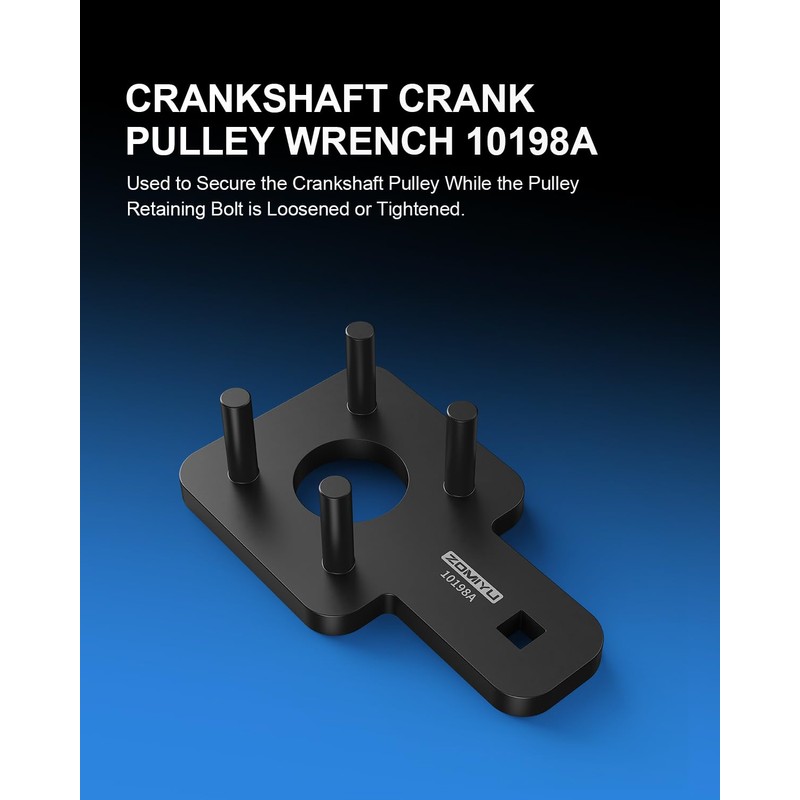 - Crankshaft Crank Pulley Wrench: The 10198A crankshaft vibration harmonic damper holder tool is used to secure the crankshaft pulley while the pulley retaining bolt is loosened or tightened. Note: If the tool pops off off the balancer when torquing on the bolt, with a little pressure on the flat surface it will stayed in place