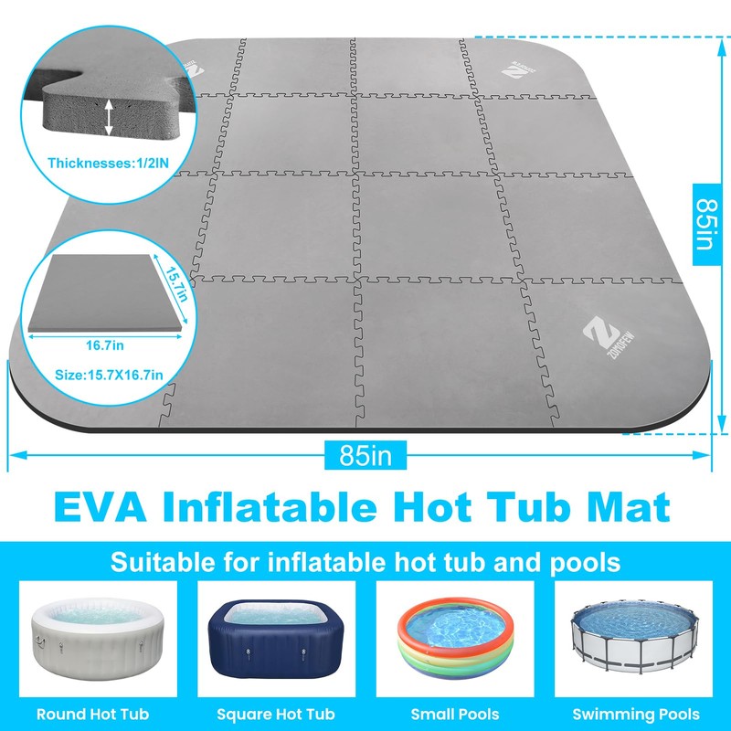 ZOMOFEW 1/2" Thickness 85IN Hot Tub Mat for Inflatable Tub,Hot Tub Pad Foundation, Upgraded Thickened Eva Foam Padding for Outdoor Hot Tubs (Square-Shaped)
