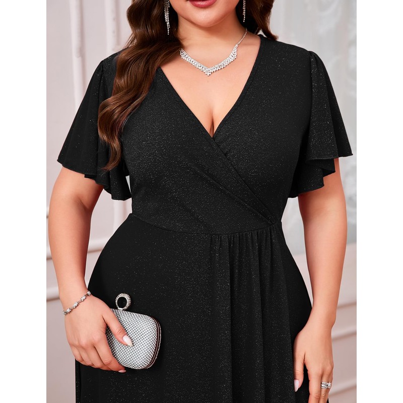 - Design: The ruffle short sleeves add a touch of sophistication, while the side ruched slit creates a graceful flow and effortless movement. The side slit elegantly showcases your legs, adding allure and enhancing your confidence with a sexy yet refined charm. This plus size prom dress also features a wrap v-neck and high waist, sculpting a slimming and elegant silhouette perfect for any formal occasion.