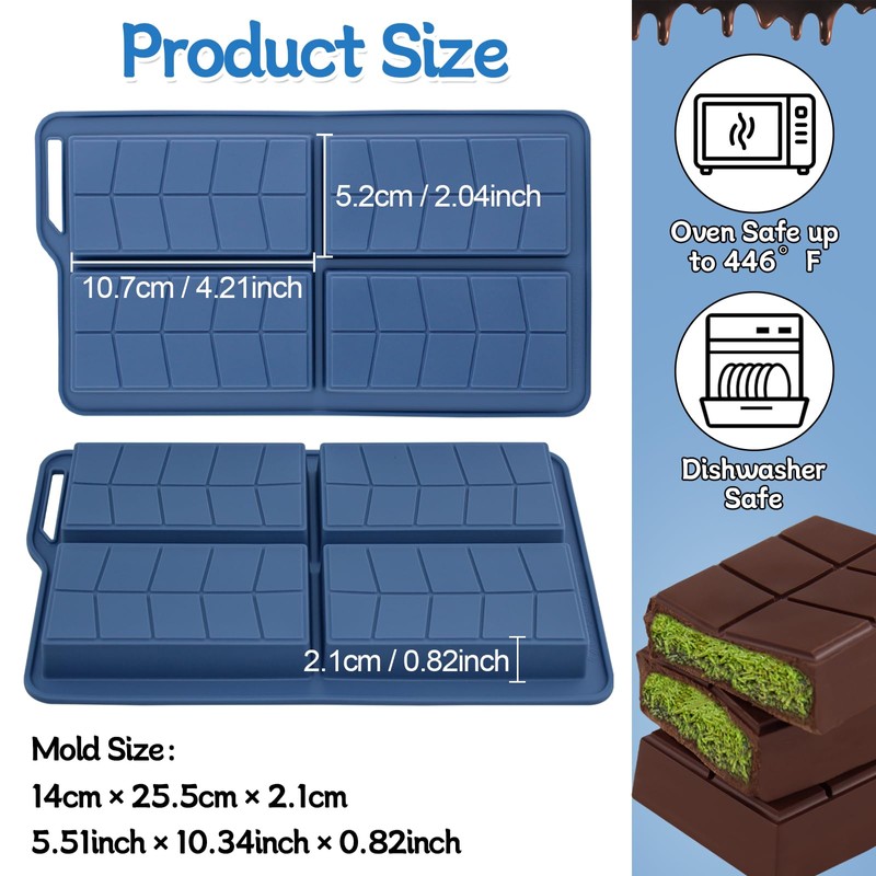 - Package:You can get 2 pack large chocolate bar molds silicone thick, it is 10.34x 5.5 x 0.82 Inches, the sizes which is perfect for filling pistachio kataifi to making knafeh pistachio chocolate bar.deep enough to make chocolate stuffed bar. The chocolate bar mold is very popular at the moment, you can make chocolate or sugar-free and low-carb foods for your families, allowing you to enjoy the delicious taste and feel the unique flavour of Dubai at the same time.