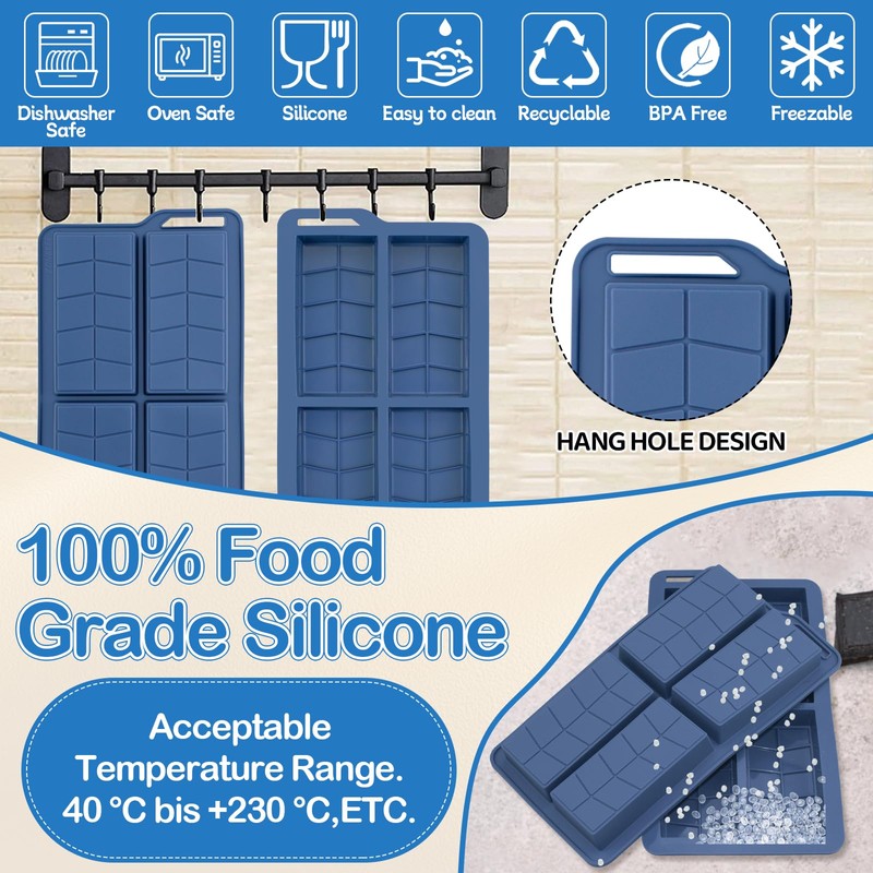 - Material:These square candy chocolate bar mold are made ofFood grade silicone , non-stick surface, easy to clean and release durable. Temperature safe from - -40°F to 446°F (-40°C to 230°C), it is safe used in microwave, oven, freezer, and dishwasher