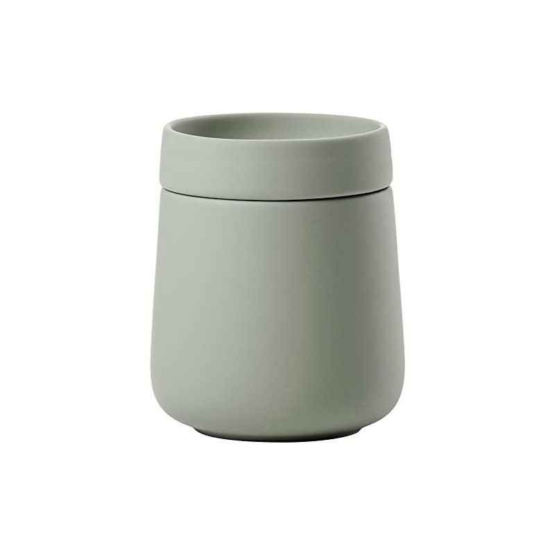 Zone Denmark Nova One Ceramic Storage Box with Lid for Bathroom Utensils such as Cotton Pads & Cotton Buds Diameter 8.4 cm, Height 10 cm, Capacity 290 ml, Matcha Green
