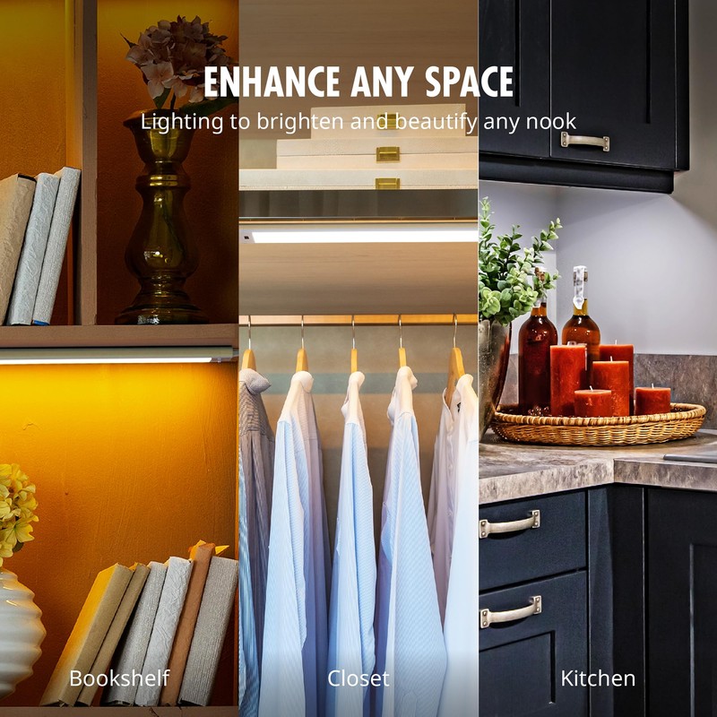 - Wide Usage: These under-cabinet lights are perfect for the kitchen, closet, cupboard, pantry, basement, stairs, hallway, bookshelf, and more.