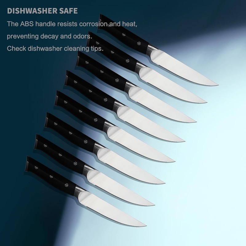 - 【Dishwasher safe for easy cleaning】Our steak knives are designed for your convenience. Both the handles and blades are made from corrosion-resistant and heat-resistant materials, making cleaning effortless. Just place them on the top rack of your dishwasher, and they'll come out like new. Please pay attention to the dishwasher cleaning tips for this product.