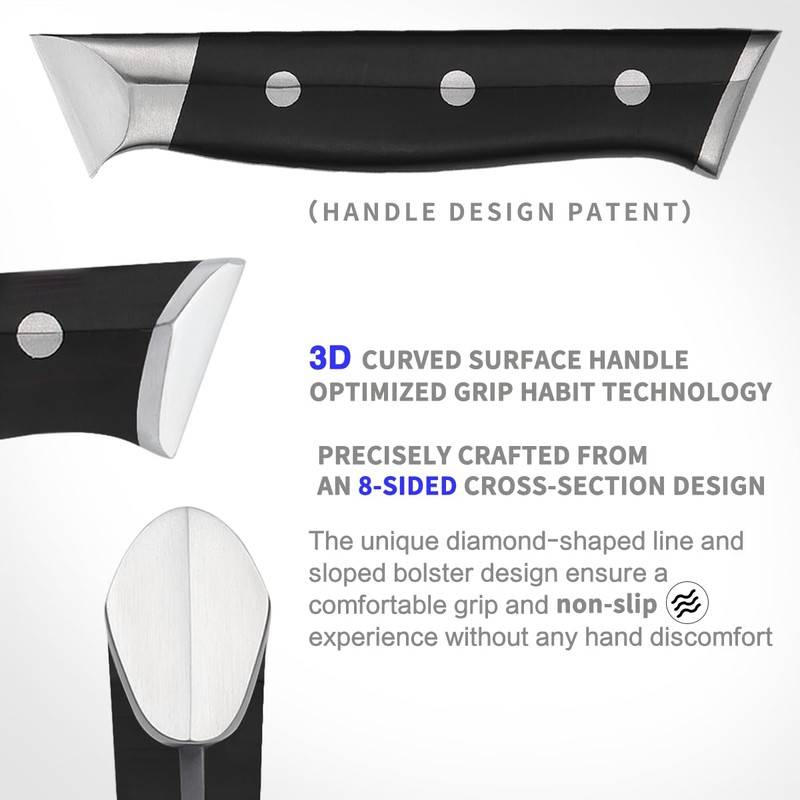 - 【Precision-designed ergonomic 3D structured handle】Our steak knife set features revolutionary 3D structured handles, crafted with precision from an 8-sided cross-section design. With its full tang structure, the thickened and enlarged contour handle offers a comfortable grip that fits perfectly in your hand, ensuring optimal balance and a secure grip for precise cutting.