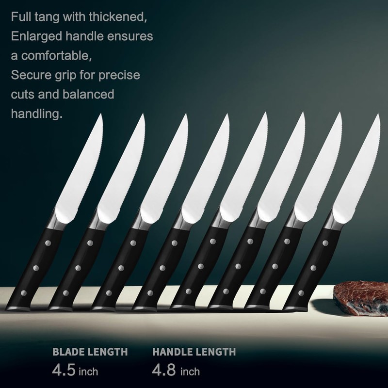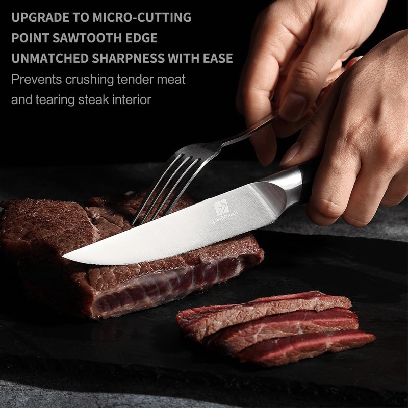 - 【Upgrade to Micro-Cutting Point Sawtooth Edge】Unleash unmatched sharpness with our steak knife set. These blades slice effortlessly through even the toughest meat. Upgraded micro-cutting points ensure clean, precise cuts with minimal effort. Drag cutting exerts less pressure, reducing the risk of crushing tender meat and preventing tearing of the steak's interior. Allow you to enjoy the delicious steak. With a 4.5-inch blade length, carving at the table becomes effortless.