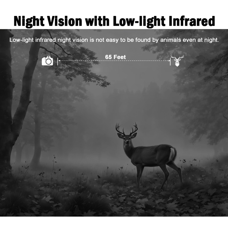 - 【Low-glow Night Vision & 100° view 】Zonkasion cell trail camera for hunting equipped with high-quality lenses and advanced 850nm low-light infrared systems, our cameras feature low-light night vision and a wide 100° of view. With a night vision range of up to 65 feet, you can vividly capture in all directions, even in the dark.