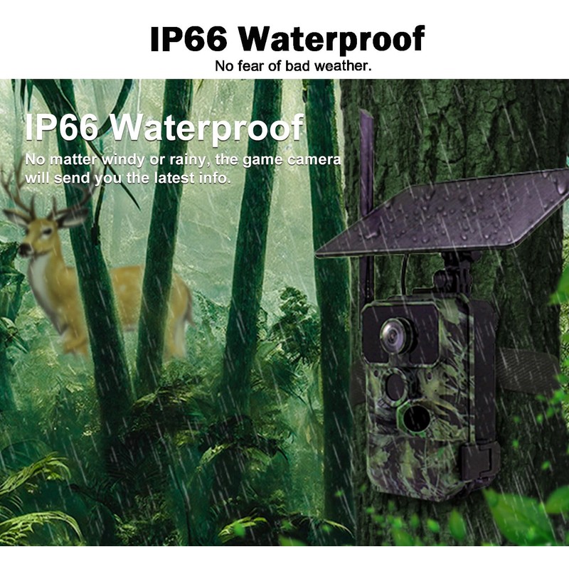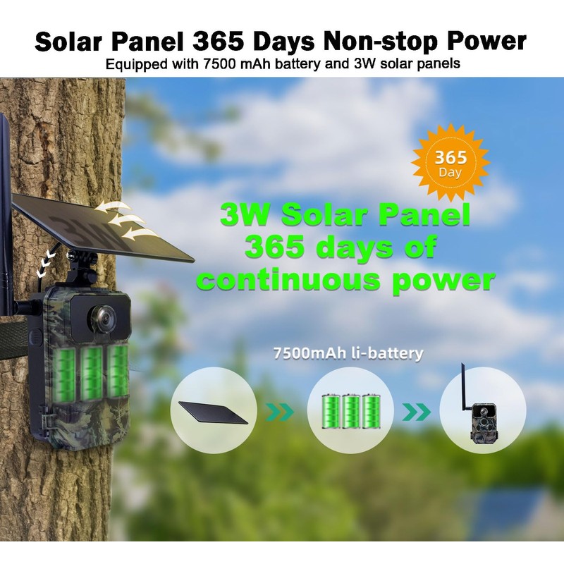 - 【Unlimited Power from Solar Panel 】Featuring a 3W trail camera solar panel and a 7500mAh rechargeable battery, these solar powered trail camera guarantee a constant power supply, eliminating the hassle of frequent takedowns and charging. No need to charge for 365 days.With an IP66 waterproof rating, they are designed to withstand diverse environments, ensuring their long-lasting performance. Provide an ideal solution for outdoor use.