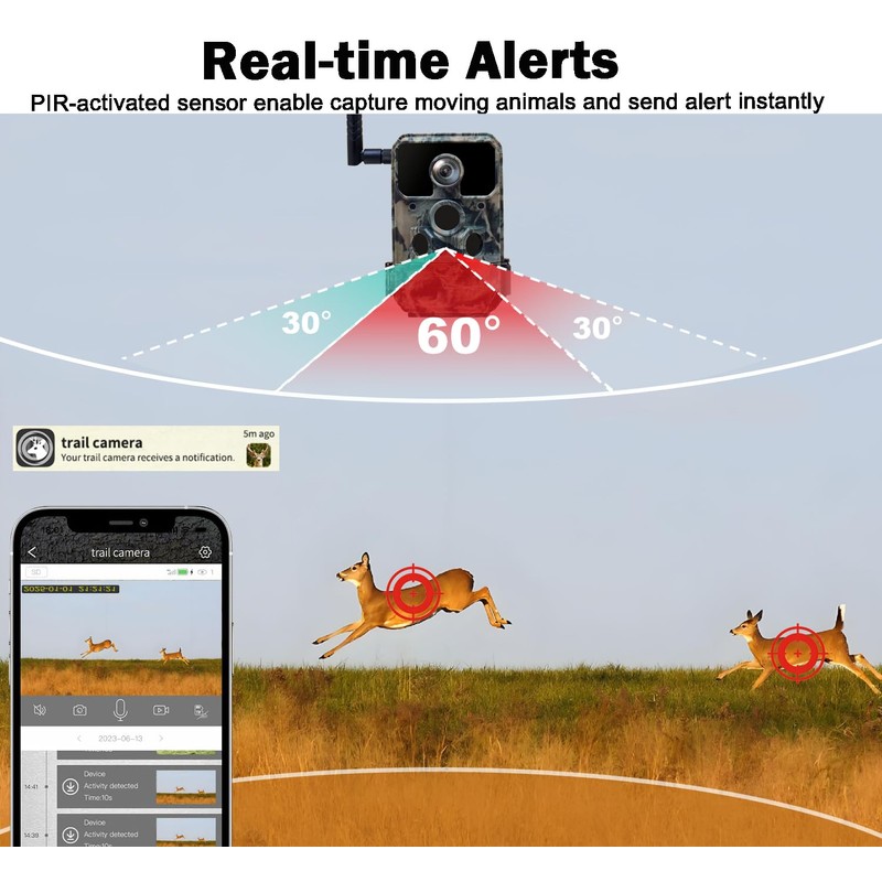 - 【EASE OF USE & VERSATILE FEATURES】To help you get started, we pre-install a 32G SD card in the trail camera's card slot and offer you 30 days of free cloud storage for new users. You can choose your favorite way to store videos. This wildlife camera also has multiple functions: multi-user sharing, two-way intercom, PIR interval, PIR sensitivity, etc. It is suitable for various scenarios such as wild hunting, remote wildlife monitoring, etc.