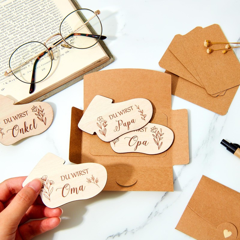 - Heartwarming design: the wooden sign in our pregnancy announcement set has the shape of a baby sock and indicates that there is a baby; on the sign are printed letters with the meaning, such as B. Du wirst Vater, Opa, Oma und so weiter