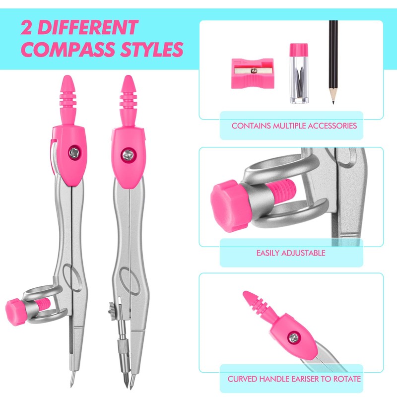 - 2 Different Compass Styles: our geometry tools set equips you with 2 styles of compasses, allowing for the creation of circles of various sizes; One compass utilizes a pencil, while the other utilizes a lead refill for drawing; Each metal compass is robust and long lasting, resisting bending or breakages during use; With an ergonomically designed top, they offer comfortable grips for easy control, further facilitated by the accompanying pencil, lead refills, and eraser for convenience
