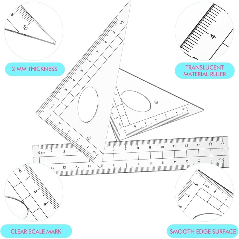 - Durable Transparent Ruler Set: our geometry supplies provide quality transparent rulers essential for geometry; Made from durable plastic material that is not prone to breaking due to its elasticity, the rulers, set square and protractor are highly reliable; Their translucent composition allows clear visibility of letters and numbers, ensuring effortless measurements of objects; Start your journey to geometry mastery with this complete set, suitable for schoolwork and exams