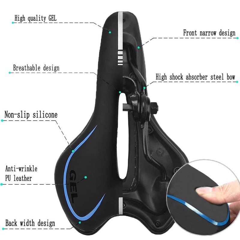 - 🚲【TRIPLE DECOMPRESSION EFFECT】There is a curved technology suspension damping bow at the bottom of the saddle to better absorb shocks. At the same time, the streamlined design of the bicycle saddle can effectively prevent friction on the inner thighs. The high-quality GEL design makes the saddle more soft and flexible. It fits the buttocks perfectly, thereby reducing stress.