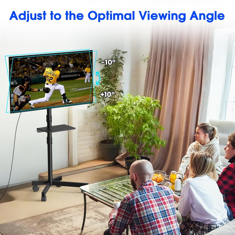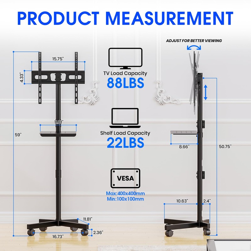 Portable Universal TV Stand: The rolling TV cart is designed to accommodate most 23" to 60" LCD, LED, OLED, or flat-screen televisions, including curved-screen models, computer monitors, and weatherproof outdoor televisions. It supports a maximum VESA mounting pattern of 400x400mm (16"x16"), ensuring wide compatibility with various TV models. The stand can be positioned close to the wall and facilitates easy movement of the television within different spaces such as bedrooms, living rooms, dormitories, homes, or offices. The adjustable design significantly enhances your viewing experience:Mobile TV carts offer adjustable height settings to customize your viewing experience, ensuring a personalized and comfortable setup. Whether for professional work, gaming, or leisure activities, this versatile solution allows you to tailor the viewing configuration to suit your specific requirements. Additionally, an optional black media tray is available to accommodate your laptop, DVD player, gaming console, speakers, or other audiovisual equipment. Sturdy, Stable, and Secure Construction for TV Cart: The mobile TV cart, constructed entirely of metal, offers reliable stability. It supports TVs weighing up to 88 lbs and is equipped with high-quality, noise-reducing casters that include locking mechanisms on all wheels for secure positioning. This cart can be effortlessly moved both indoors and outdoors, providing versatility in various environments. Ideal for Mobile Use in Any Environment: The rolling TV stand moves effortlessly, and the brakes on the wheels are highly effective thanks to its 360° rotating wheels. The 360° rotating wheels are small yet sturdy, allowing you to effortlessly move the device out of the way when additional space is required. You can conveniently maneuver it both indoors and outdoors, as well as in any location where it is needed. Its compact design enables it to be positioned close to walls, conserving valuable space while offering an elegant solution for your entertainment and presentation requirements. Easy Assembly:Everything is meticulously organized and packed, with all components clearly listed in the instructions. To ensure a smooth and effortless installation process, it is recommended to lay out all the parts beforehand. Following the step-by-step instructions carefully and paying close attention to the positioning of each piece will make assembly straightforward and seamless.