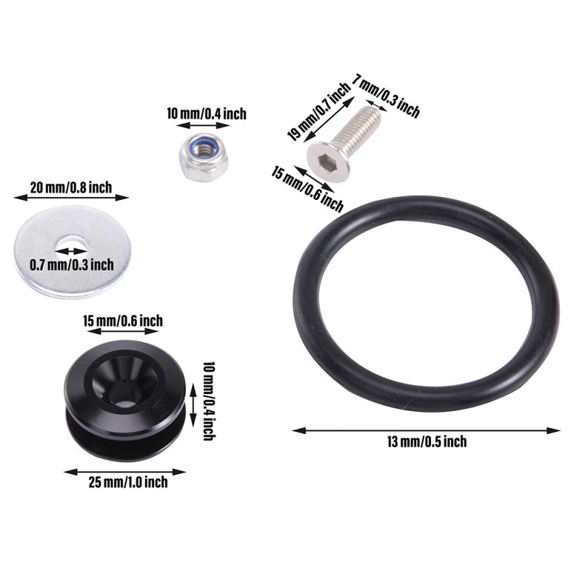 Dimensions: Aluminum Fastener: 25x10mm, Washer: 20mm, Nut: 10mm, Bolt: 7x19mm, O-ring: 13mm.