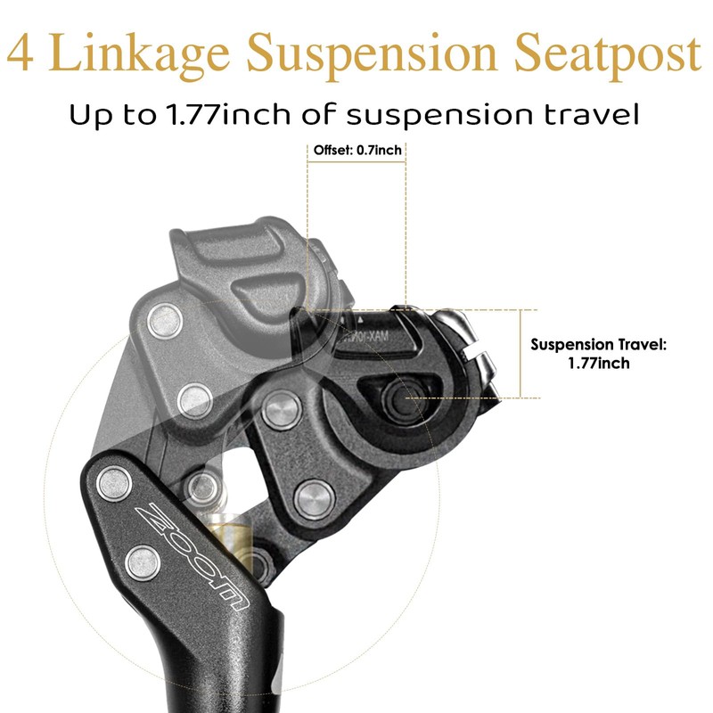 - 【Advanced Four-Bar Linkage Suspension】Parallelgram mechanism maintains a consistent saddle angle throughout its full 45mm travel, ensuring stability and comfort on uneven terrain.