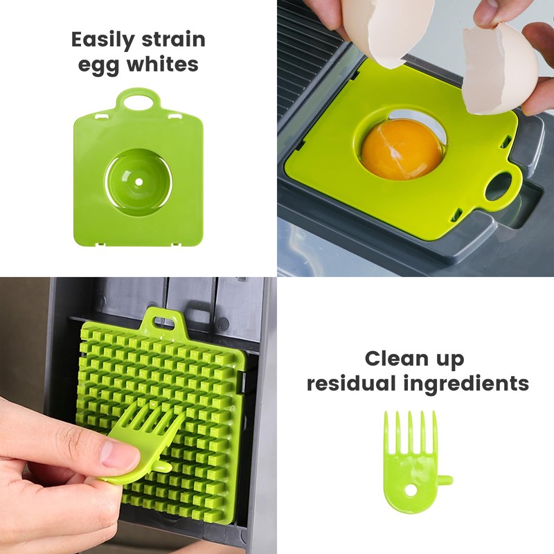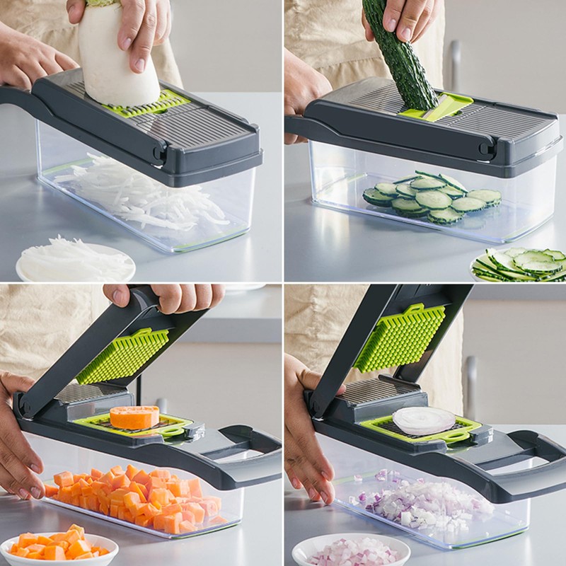 - 【Unique Design and Function】 - Use our multifunctional vegetable chopper to make preparing your meals even more enjoyable. It includes an onion slicer, cucumber slicer, potato cutter, salad cutter, cheese grater, side slicer, fruit cube slicer, julienne garlic and ginger slicer. It is a perfect kitchen assistant for anyone who cooks.