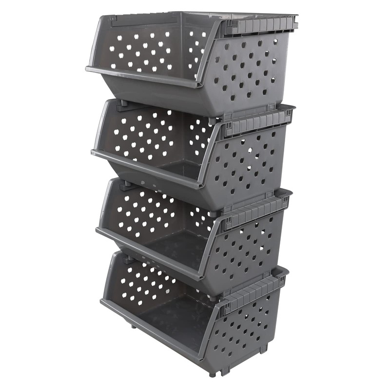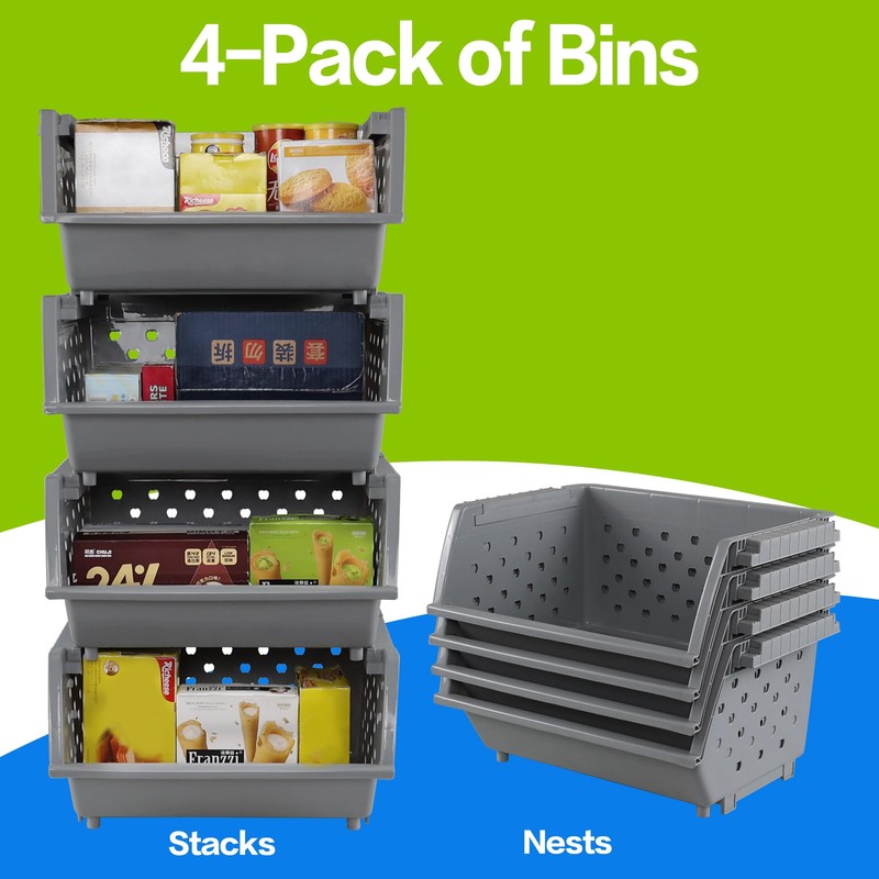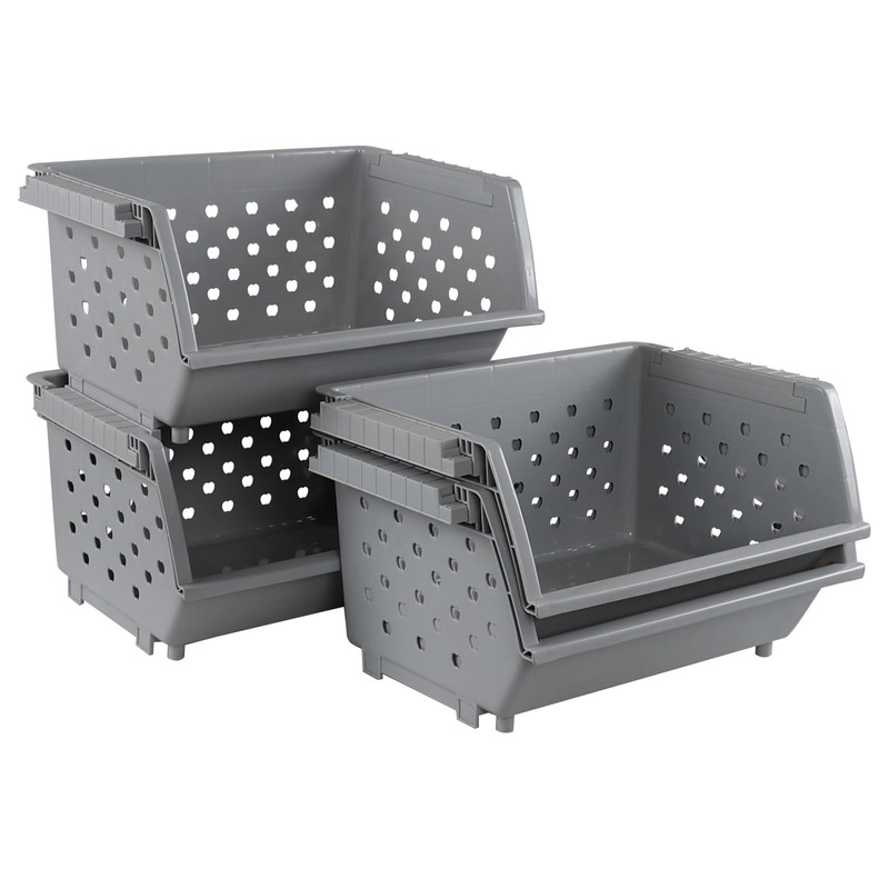 Zopnny 4-Pack Plastic Stackable Storage Basket Organizer, Kitchen Stacking Shelf Baskets, Grey