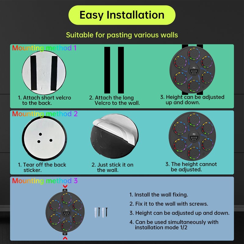 - 【MUSIC+Bluetooth】 Smart music boxing equipment comes with upgraded speakers and surround sound, supports Bluetooth pairing. Cool light effects and special effects sound flashes following the rhythm of your music, making your boxing training more fun and exciting.