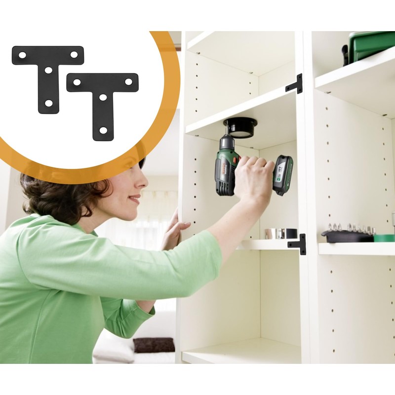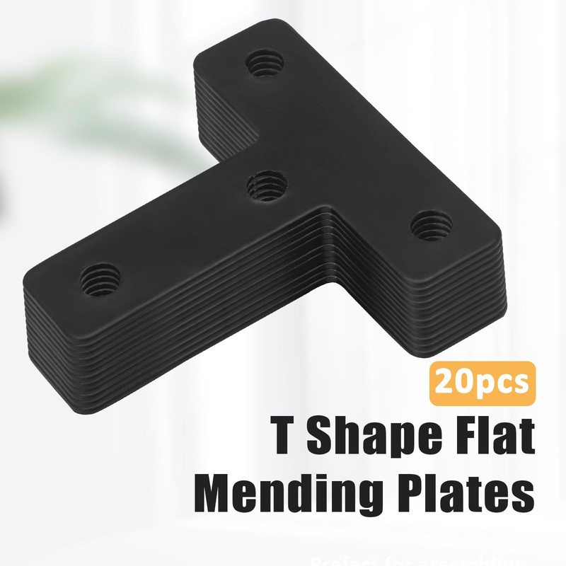 Zorfeter 20 Pcs Black T-Shape Corner Brackets, 50x50 mm/ 2"x2" T Flat Corner Brace Fixing Repair Plates for Shelves & Furniture, with Screws