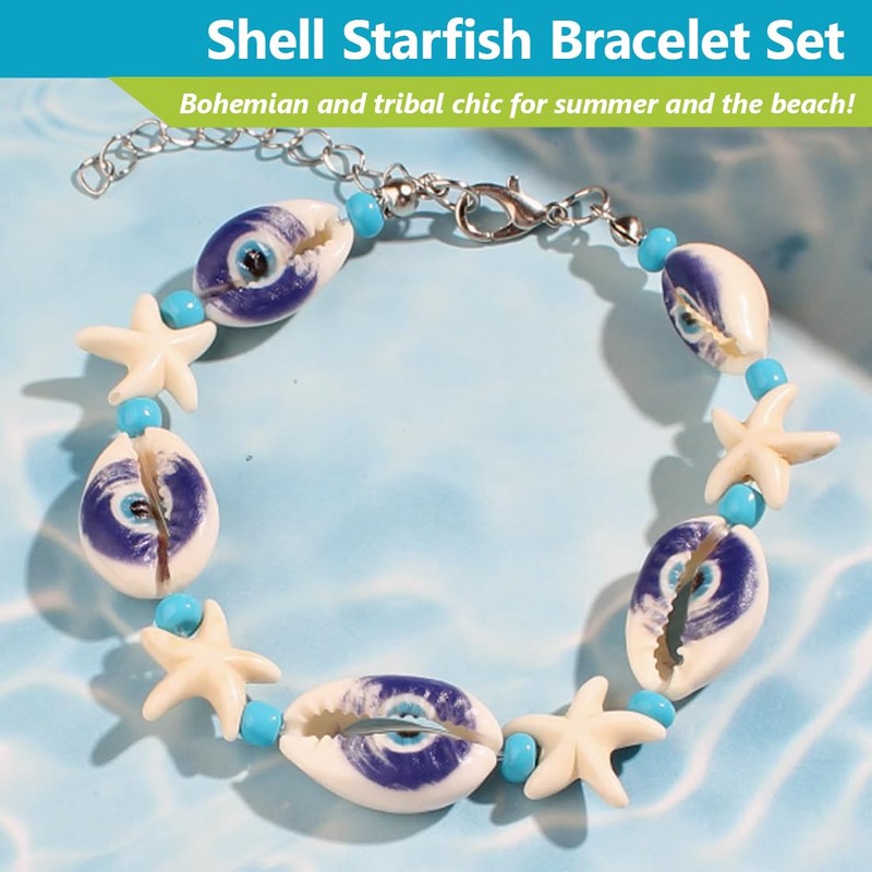 2er Set Vielfalt: Sie erhalten zwei einzigartige Muschel Armbänder jeweils mit natürlichen Kaurimuscheln verziert mit dem traditionellen Evil Eye Symbol auch bekannt als Nazar Boncuk und maritimen Seestern Perlen eines mit grünen das andere mit türkisfarbenen Akzenten