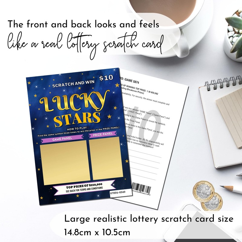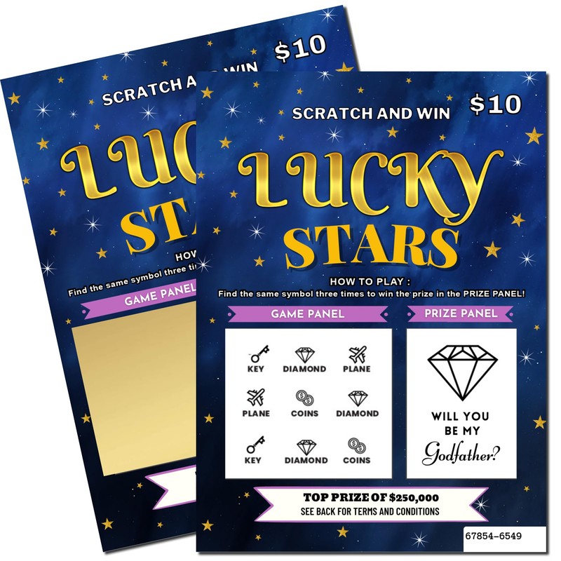 - LOOKS AND FEELS LIKE A REAL LOTTERY SCRATCH OFF CARD! The card is designed to replicate the look, size and feel of real life US lottery scratch cards. The card is made of premium quality card stock, with authentic gold scratch off material. The recipient won't suspect a thing! The Game Panel reveals 3 matching diamond symbols, and the Prize Panel reveals the message "Will you be my Godfather?". The back of the card also has a realistic look with game instructions.