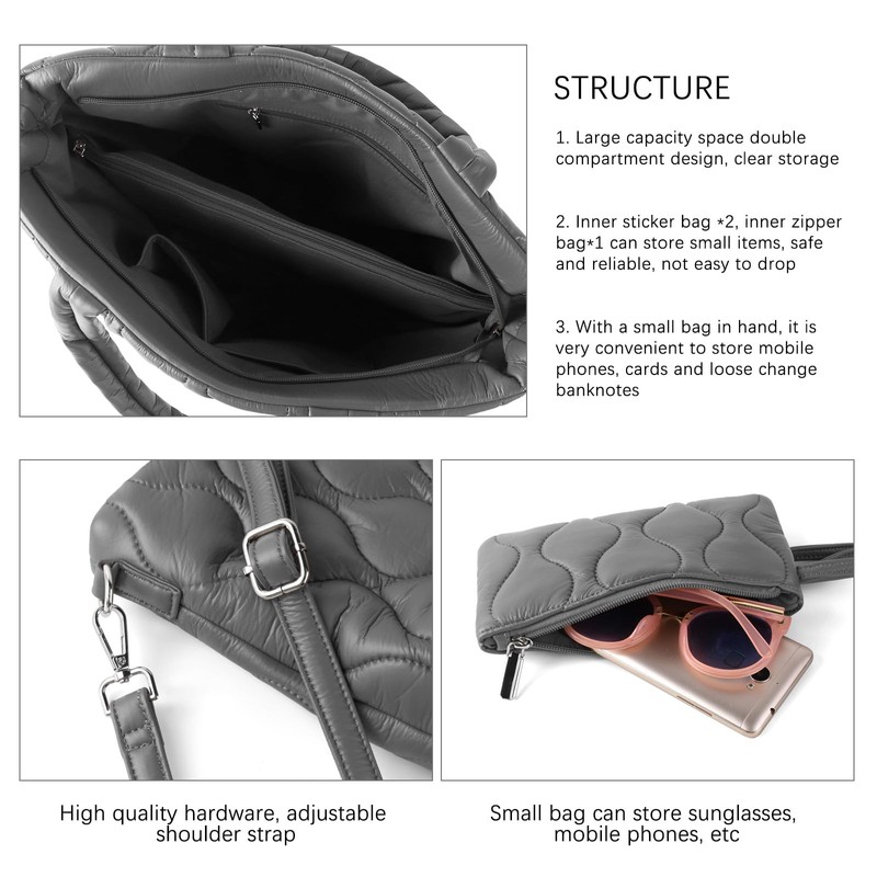 ZOSIVEB Puffer Tote Bag with zipper for Women, Large Quilted Handbags,Shoulder Bag,Top Handle Satchel for Travel,Work (Gray)