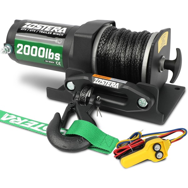Zostera 2000lb ATV Winch Electric 12V,with Synthetic Rope, RV Waterproof Towing Winches,with Wired Manual Remote Controller Switch,with Mounting Plate, Fairlead&Hook