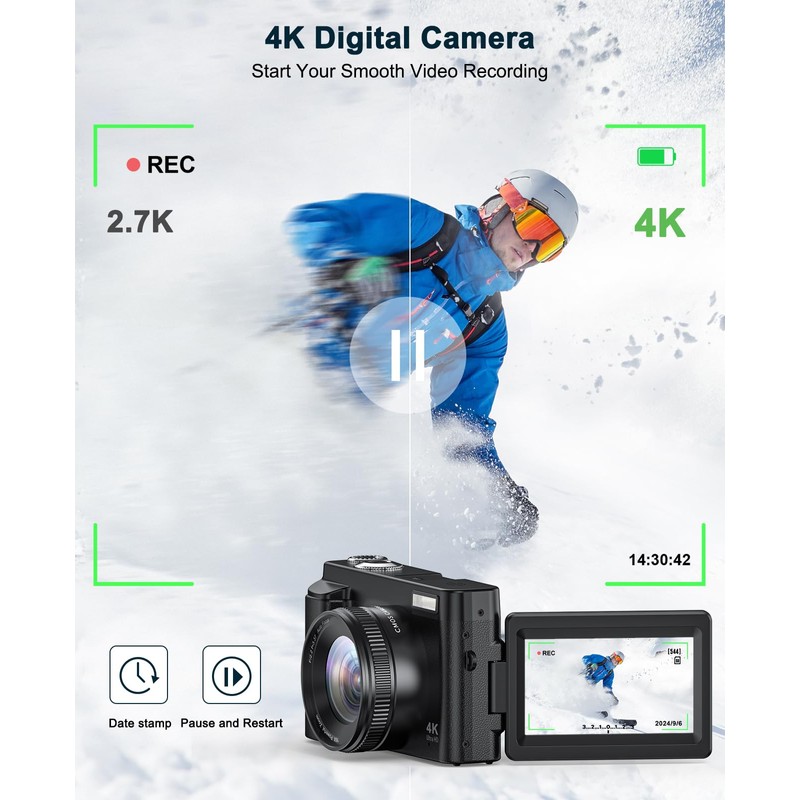 - [PERFECT GIFT FOR SHARING FUN] Fashion point and shoot digital camera for beginners and teens is full-featured and easy to use! The 4K photography camera makes everyone use it easily in home life, social software, travel, or festivals! Also, This compact camera is the perfect gift for yourself, lovers, friends, children, or parents for Valentine's Day, Thanksgiving, Christmas, and birthday day! Come and start your innovation!