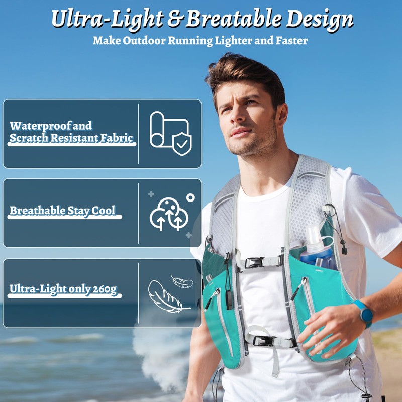 • Versatile use: the Zounich running vest adapts seamlessly to any outdoor activity: from city running to trail marathons. The lightweight design with ergonomic adjustment straps ensures comfort with every move, while the durable, water-repellent material protects the vest from moisture and wear and tear. Equipped with multiple pockets for quick access to drinks, snacks, it is an indispensable companion for all outdoor activities.