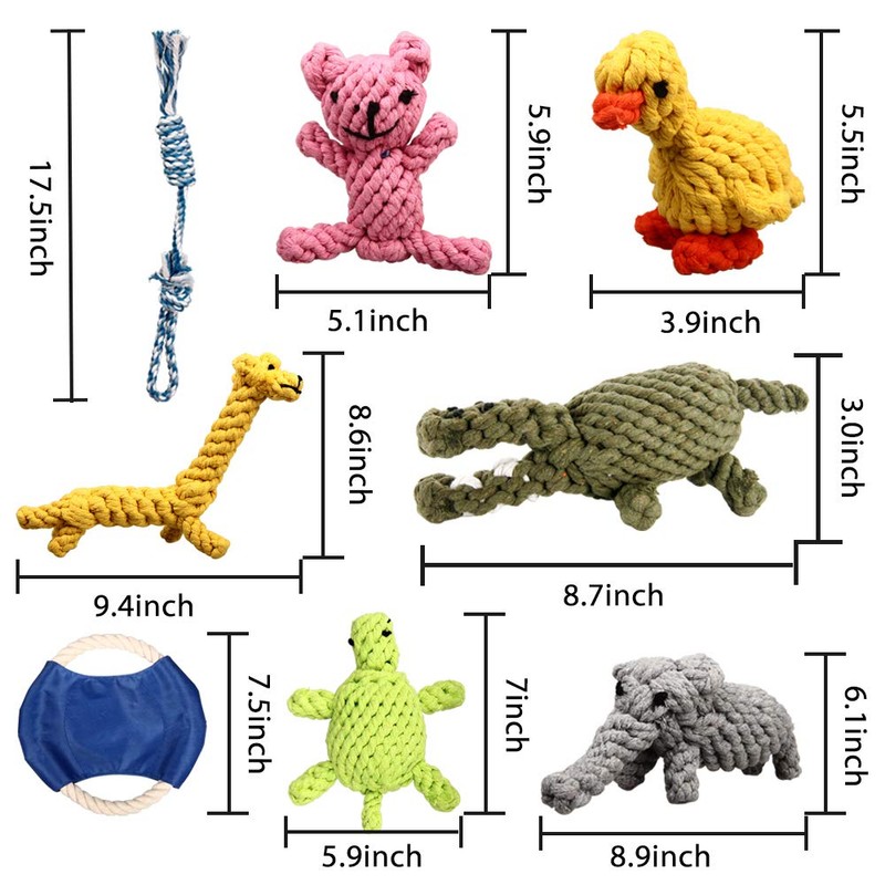 - Dogs Rope Toys’ Perfect Combination: ZOUTOG dogs chew toys consist of various colors cartoon animals. Including elephant, crocodile, little bear, giraffe, duck, tortoise and also equipped with a rope and a flying disc (total set of 8). For dog chewing, puppy teething, dog teeth cleaning, playtime and more.