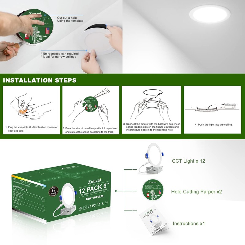 zouzai 12 Pack 6 Inch 5CCT Ultra-Thin LED Recessed Ceiling Light with Junction Box, 2700K/3000K/3500K/4000K/5000K Selectable, 12W Eqv 110W,Dimmable, led can Lights- ETL and Energy Star Certified