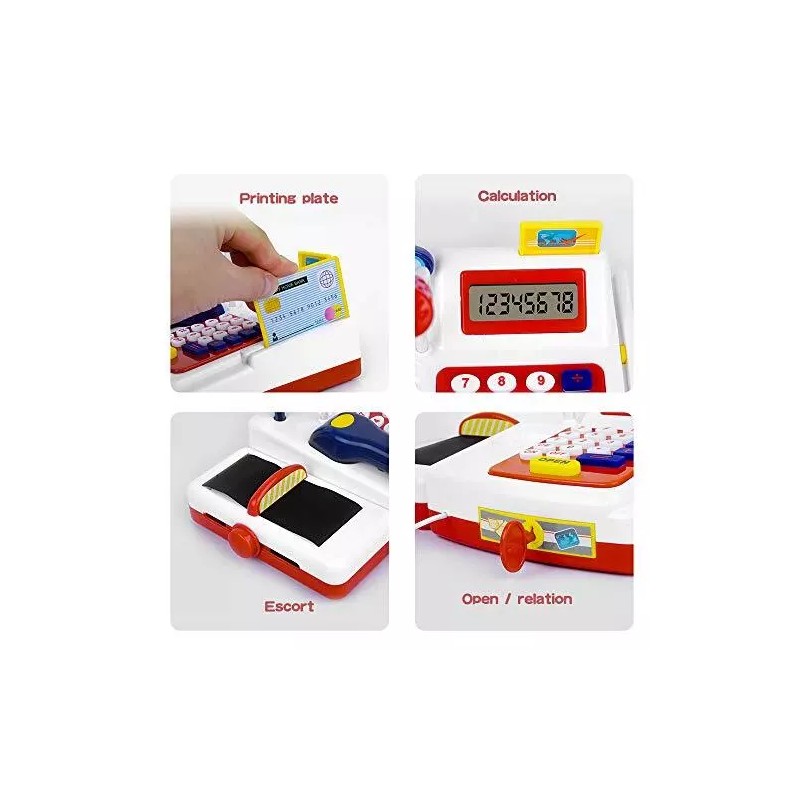 Features and specifications: Complete playset ,Working calculator ,Voice microphone,Credit card swipe ,Moving conveyor belt ,Light and sounds Cash Register Play Set included: 1 X cash register, 1 X shopping basket,1 X credit card,8 X play coin,9 X play bill,5 X grocery toy.