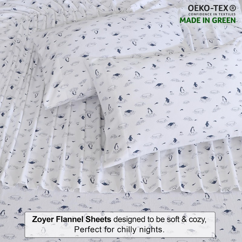 ZOYER Flannel Sheets California King Size - Soft & Comfy Deep Pocket Cotton Flannel Bedding, Fitted Up to 16", Double Brushed Cal King Bed Sheets Set, 4 Pieces, Penguin Peg