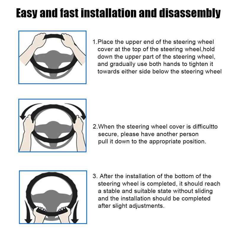 - Easy to Install & Remove: This car steering wheel cover is easy to install and remove. First, you should place the steering wheel cover on the top of the steering wheel. Then, you just need to press the upper part of the steering wheel cover and use both hands to pull the sides of the steering wheel cover down gradually so that it covers the steering wheel completely and fits the steering wheel tightly to complete the installation.