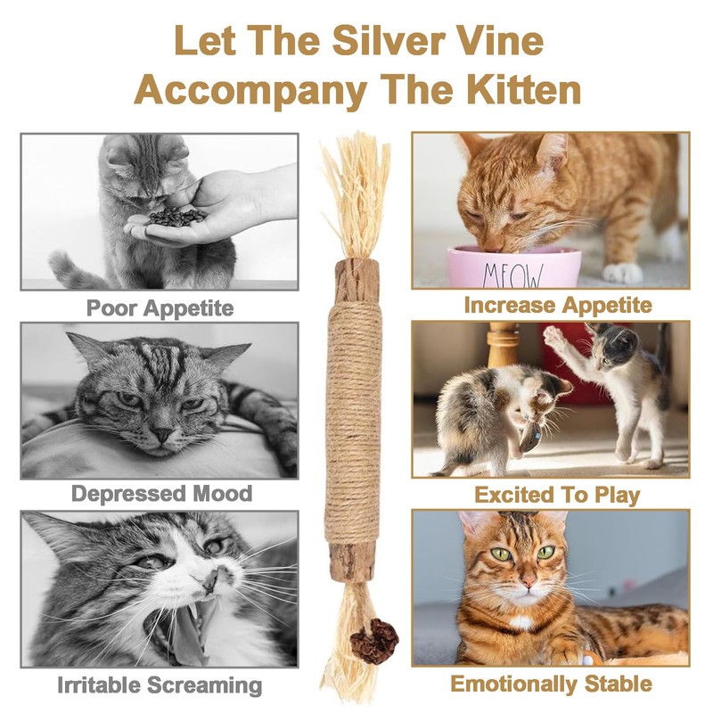 • 【Discharge Hair Balls Improve Digestion】 natural silvervine stick cat chew toy are rich in plant fiber, supplement vitamins, the silver vine for cats promotes gastrointestinal motility, and enhance appetite, induces vomiting hairballs to help cat health